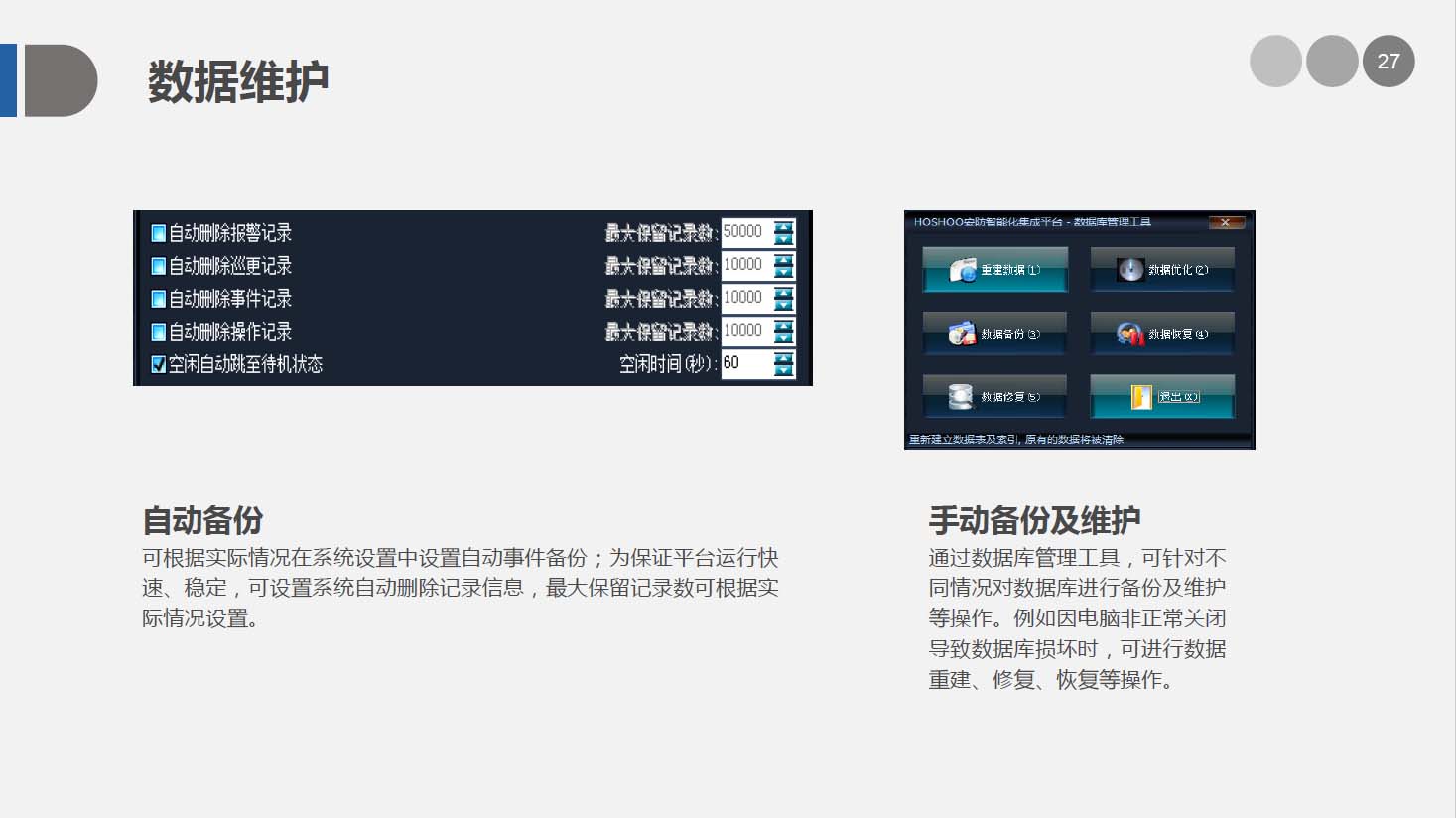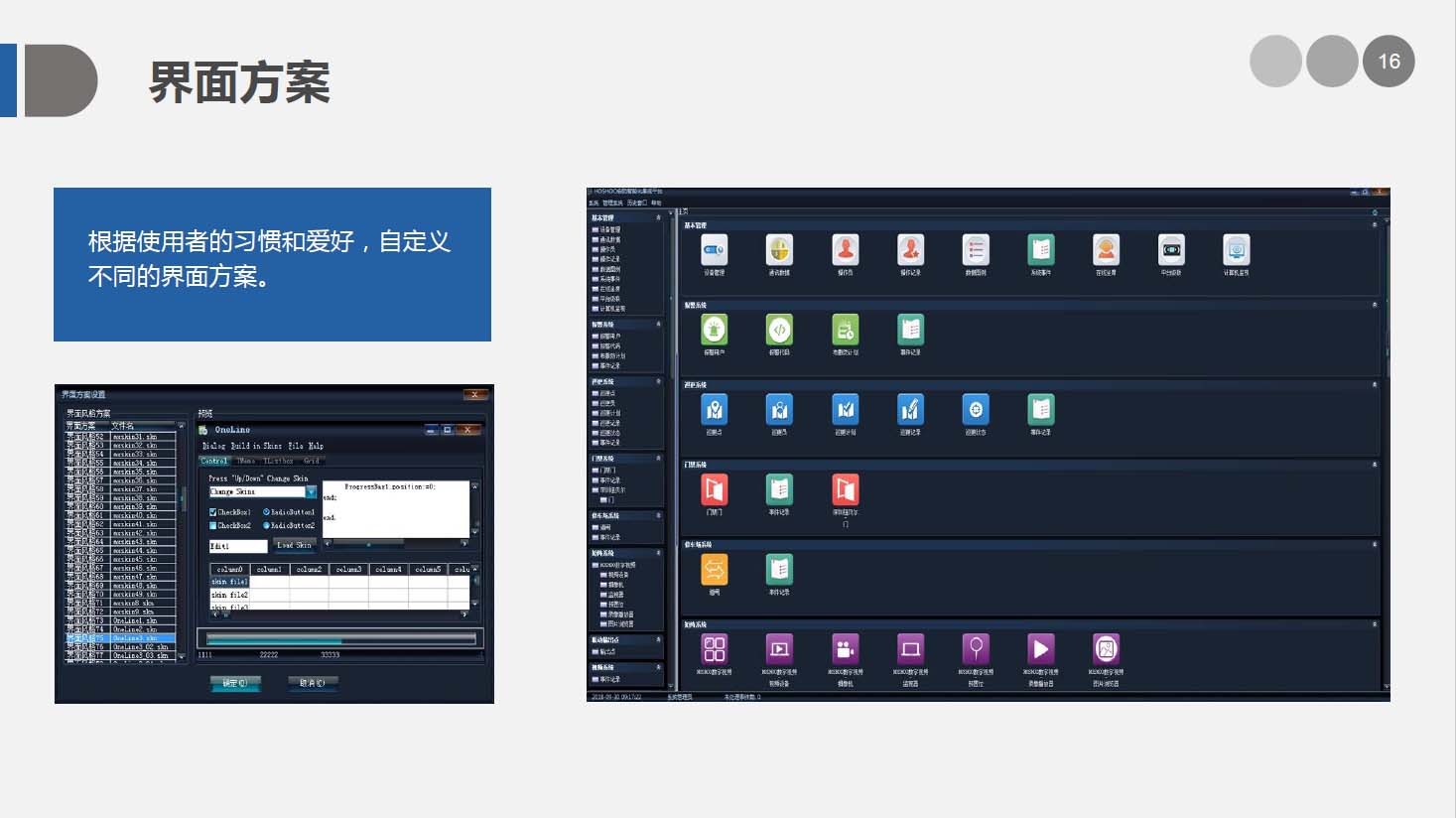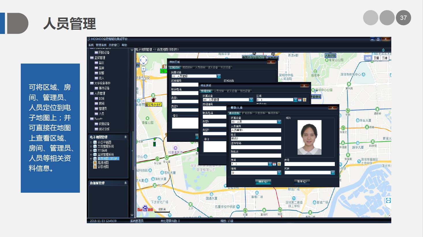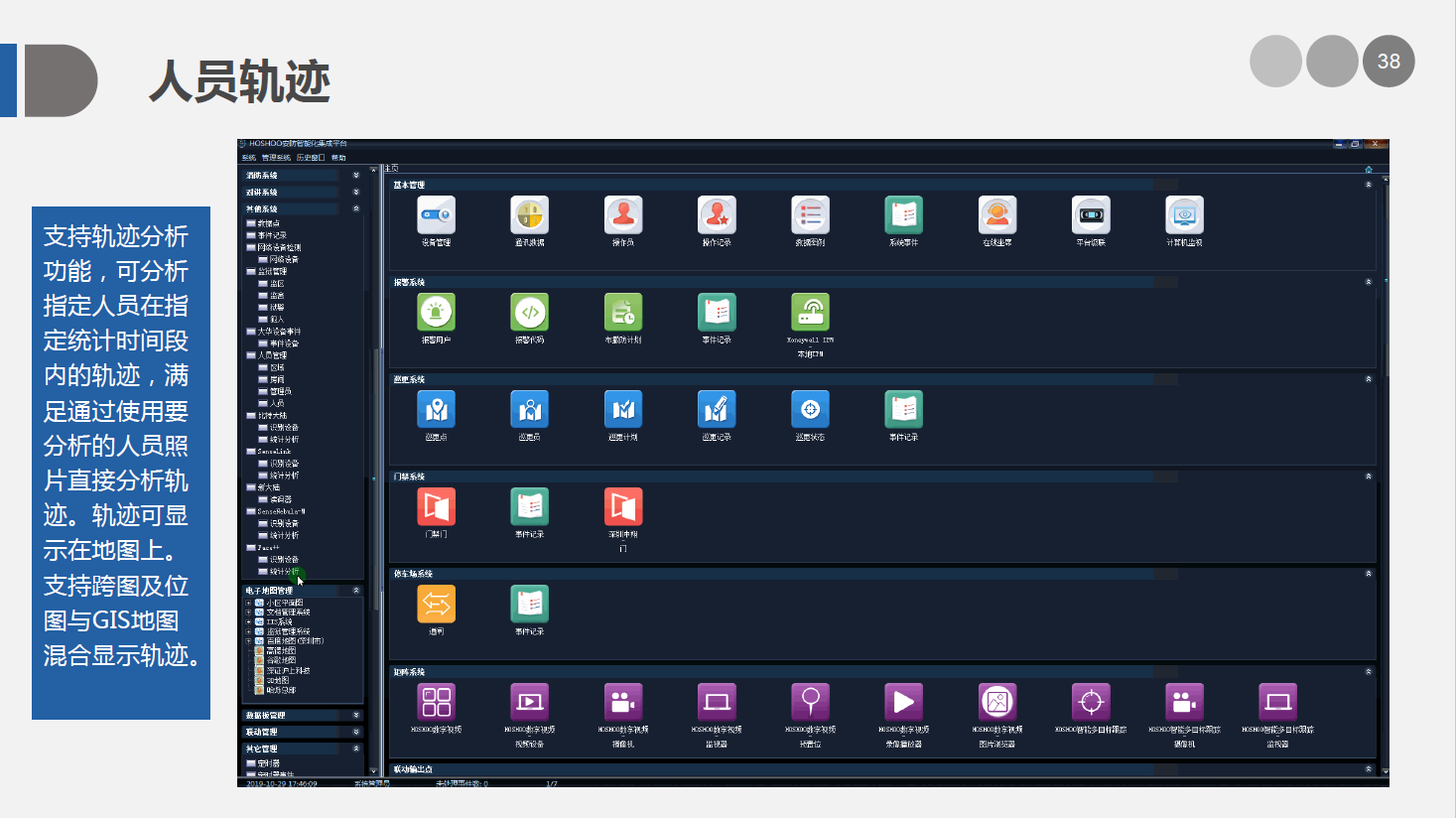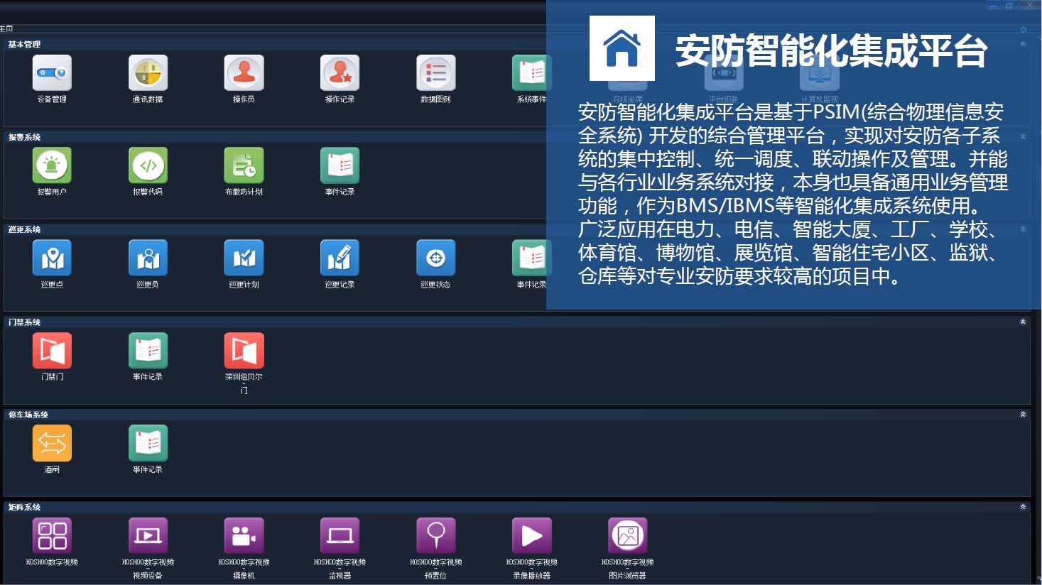 HOSHOO安防智能化集成平台是综合安防管理系统平台,管理安防的各个子系统,如报警、门禁、视频等子系统,并对各子系统进行相应的控制和联动。适用于楼宇、文博、监所、电力、金融、教育、交通、制造等各个领域。广泛的支持各子系统的主流厂家,具有灵活的集成接口。