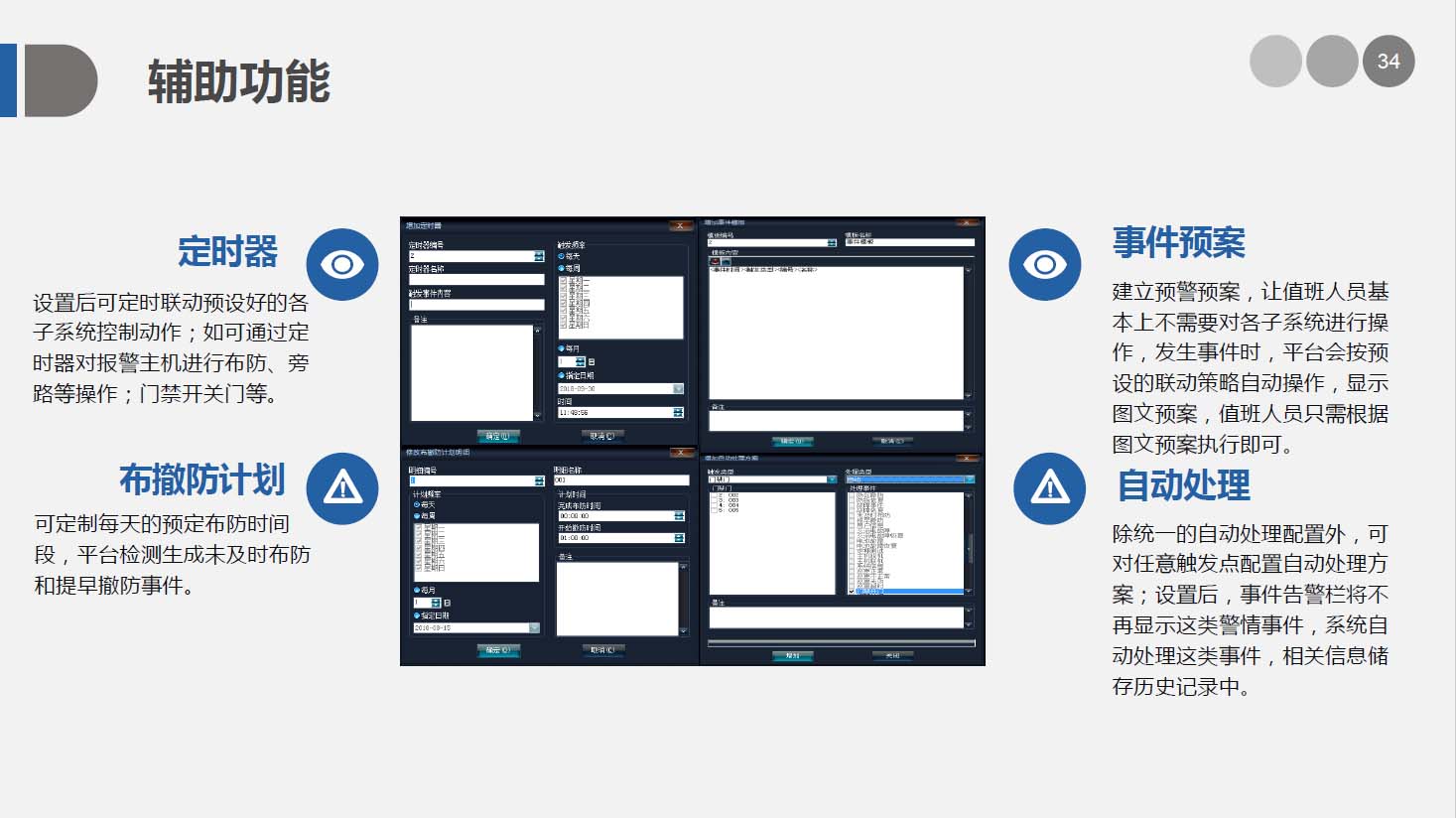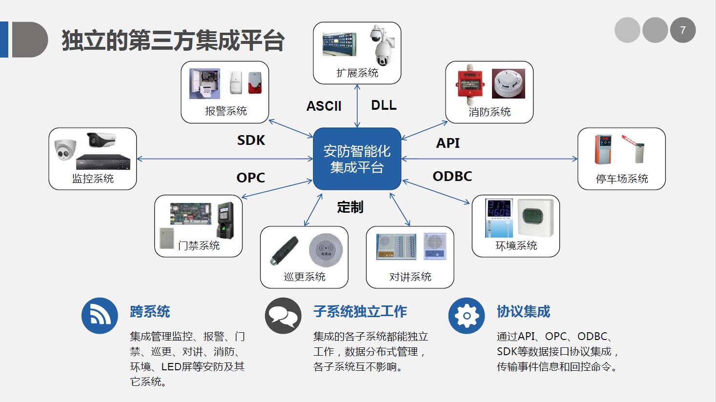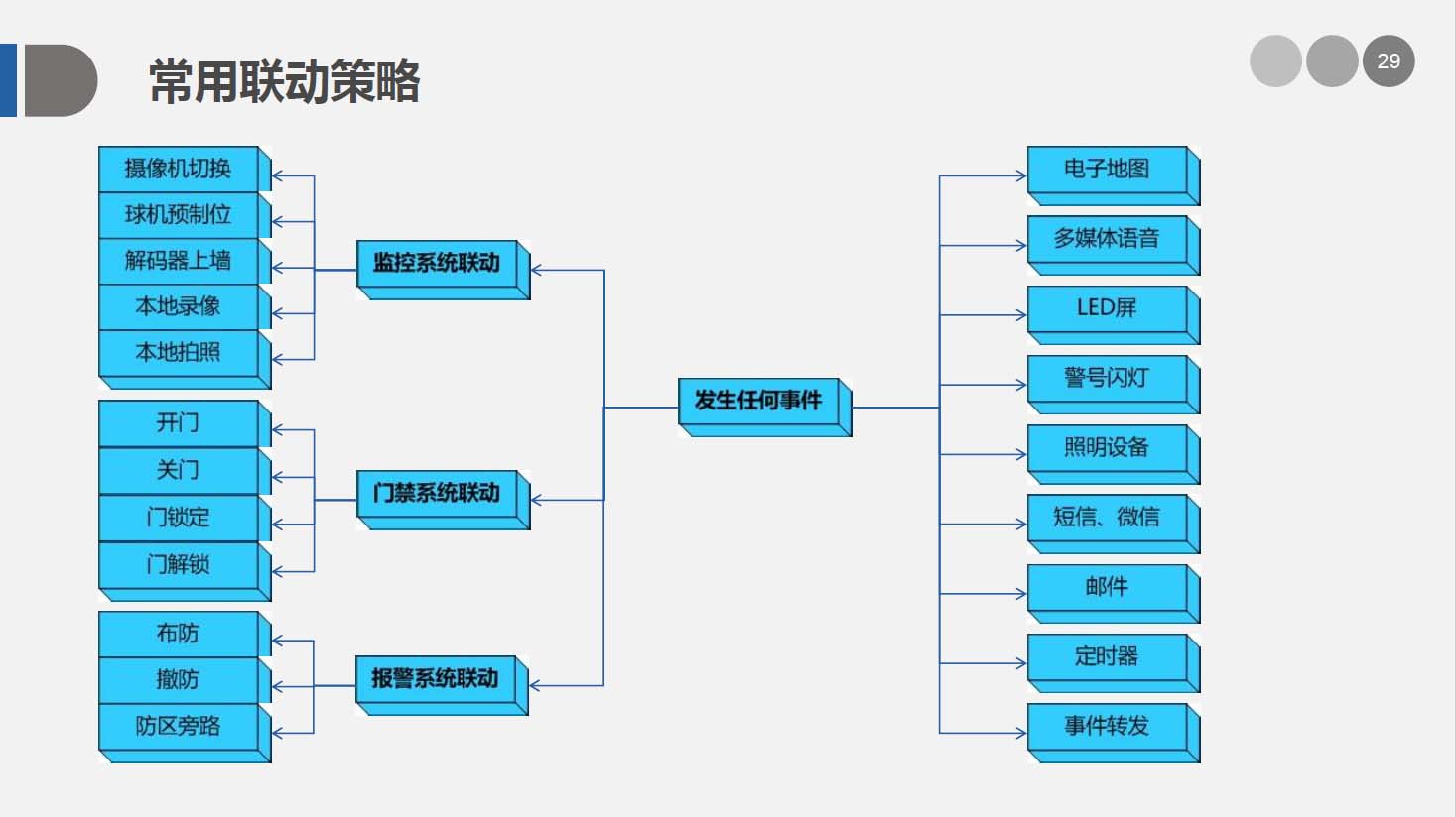 安防智能化集成平台可根据实际需求任意扩充功能模块进行,并可以通过平台实现各个系统之间的联动、协调工作。从而大大减少了硬件设备和工程的数量,提高整个系统的自动化程度和监控中心的工作效率,完美地将这些系统之间的功能通过安保集成系统,来体现发生事件时如何做自动化处理及相应流程。