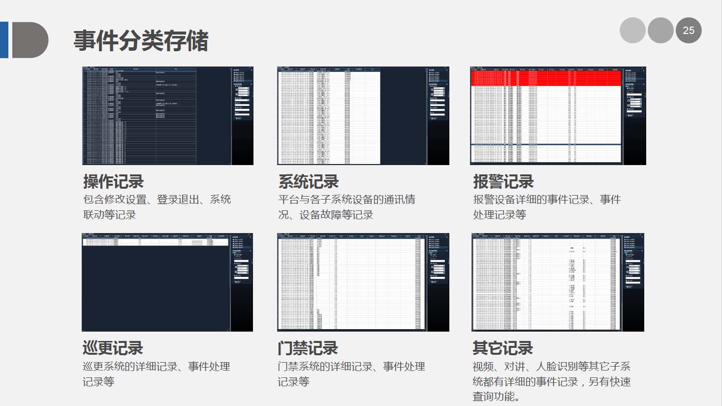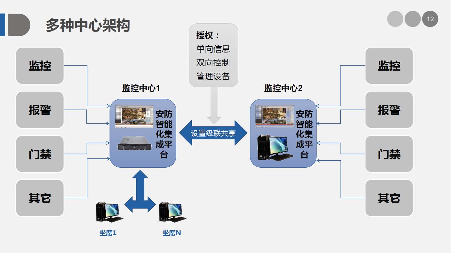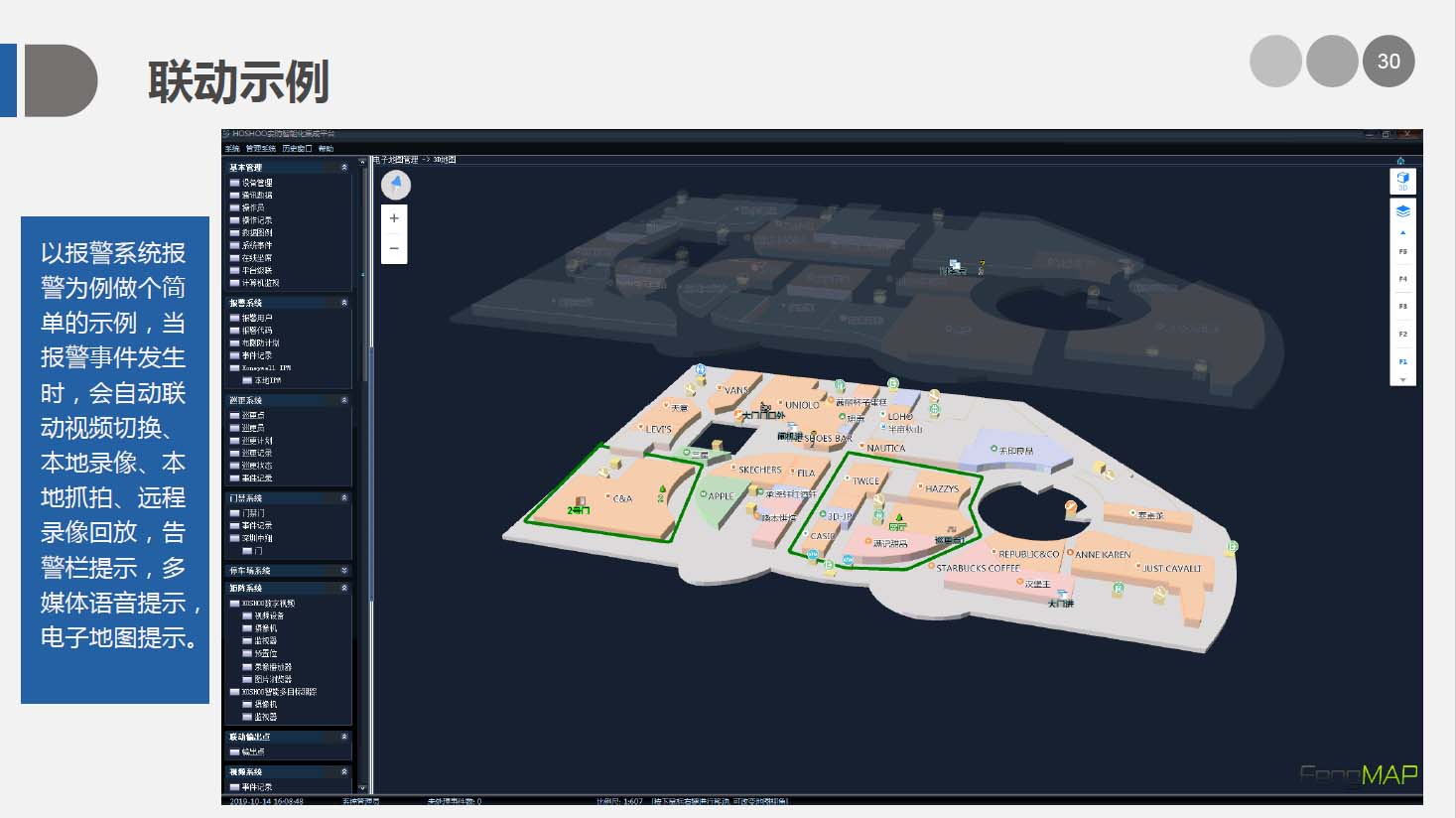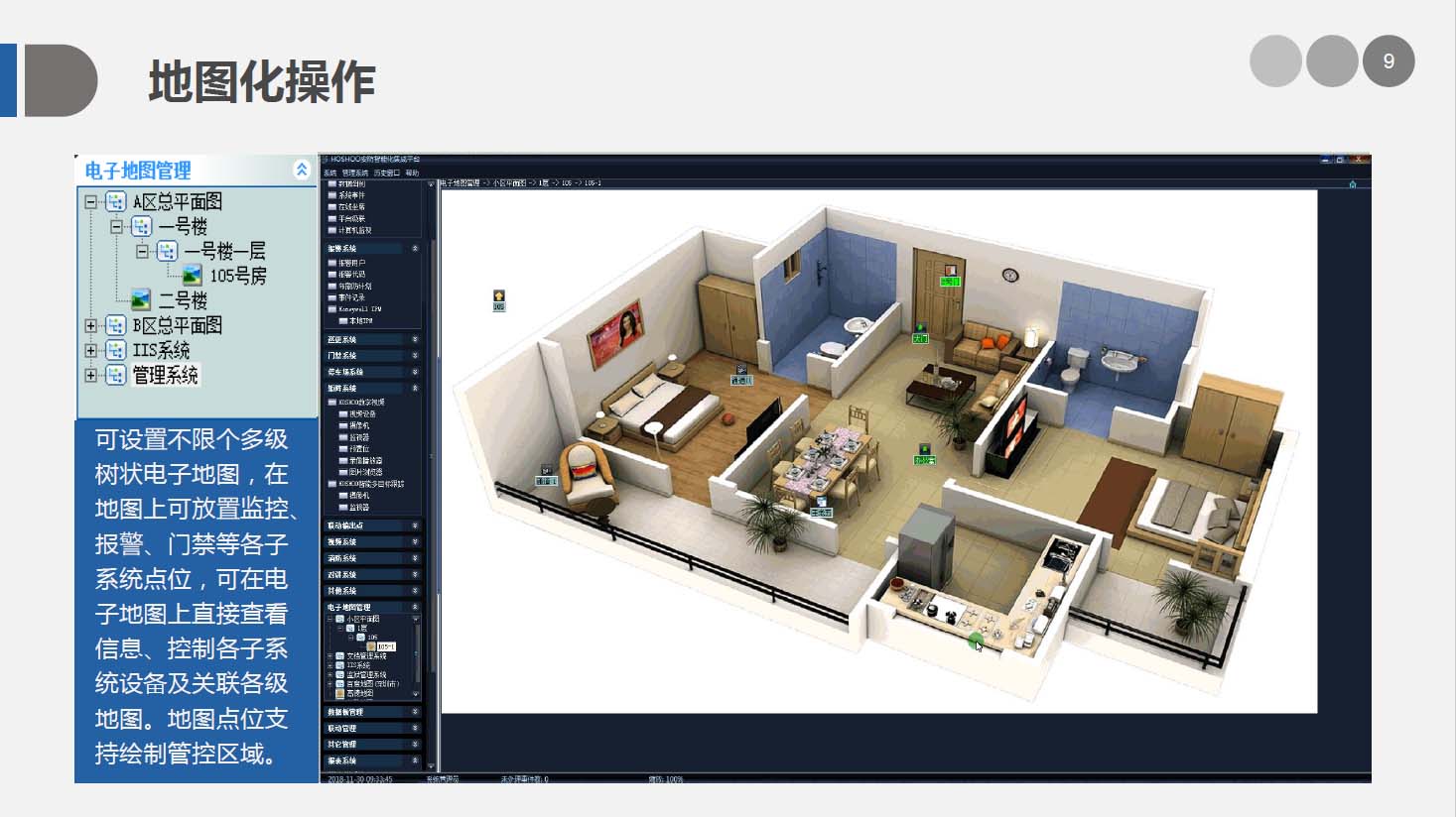 安防智能化集成平台能实现对视频、门禁、报警、对讲、巡更、车辆管理等多个子系统集中控制,统一调度使用,实现各个子系统之间的联动操作及管理。高度智能化的综合安防管理平台应具有适应于各种不同需求的网络架构、高度的可靠性、良好的人机交互界面、易于管理及维护、学习简单及操作方便等特点。