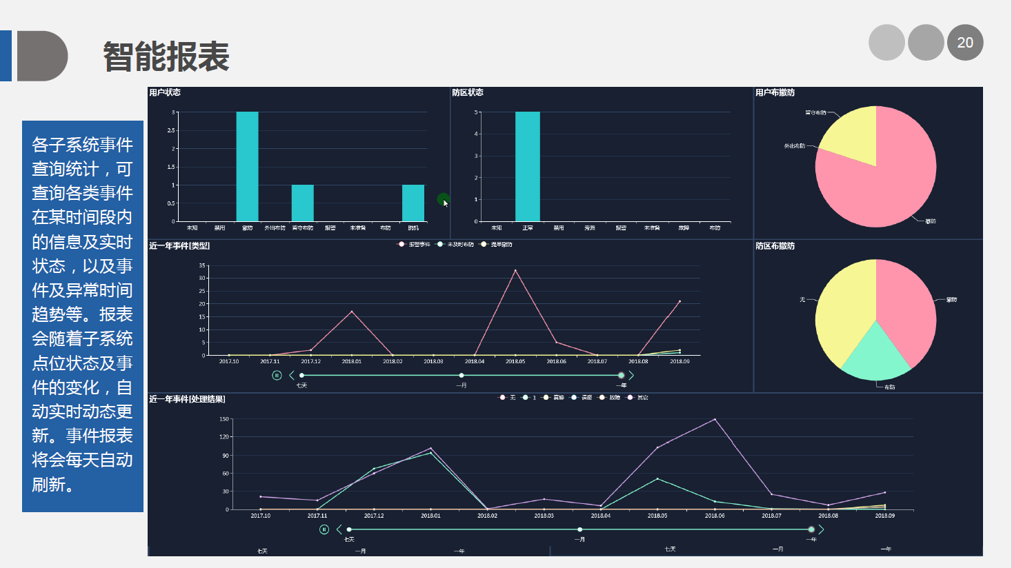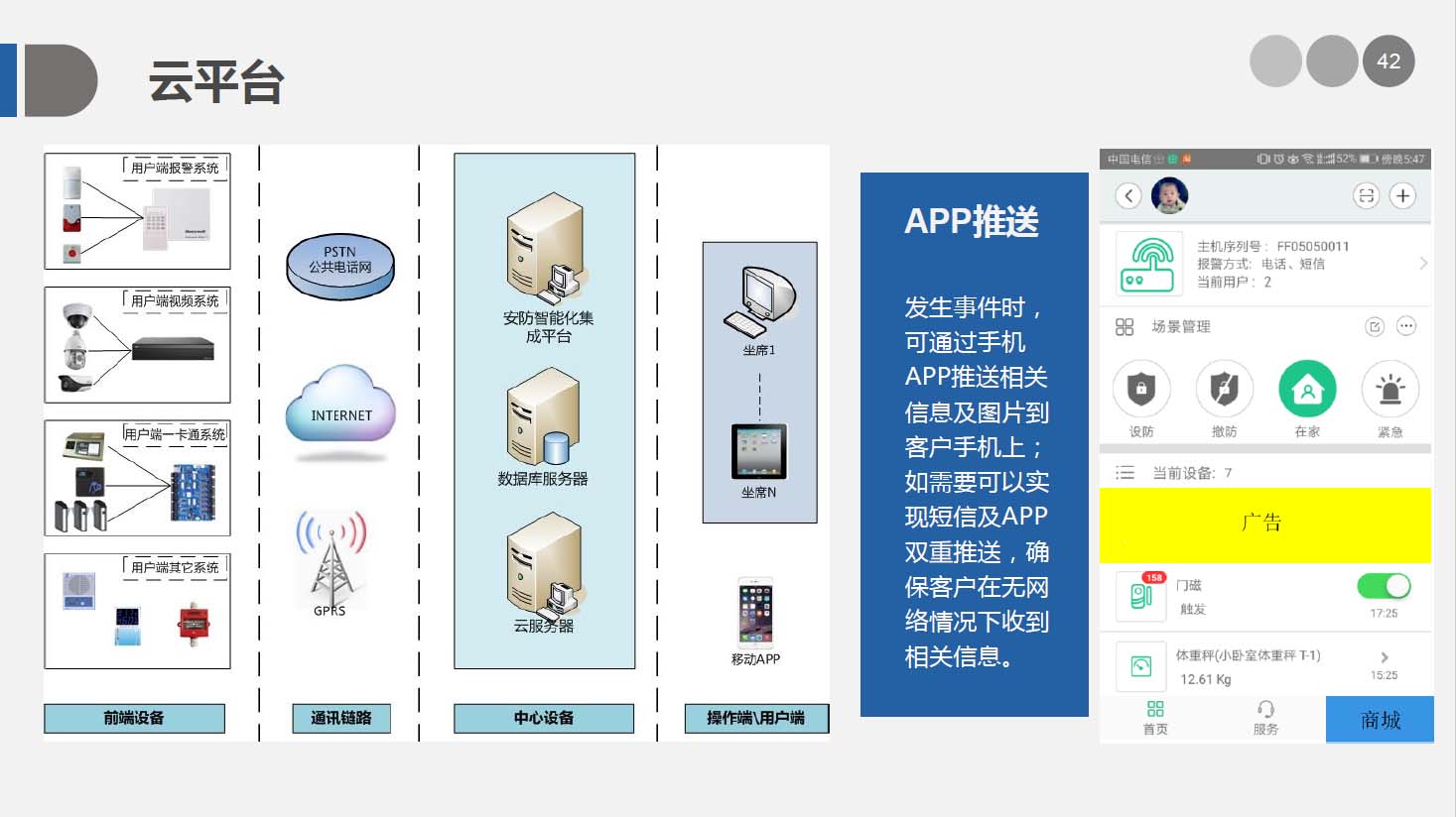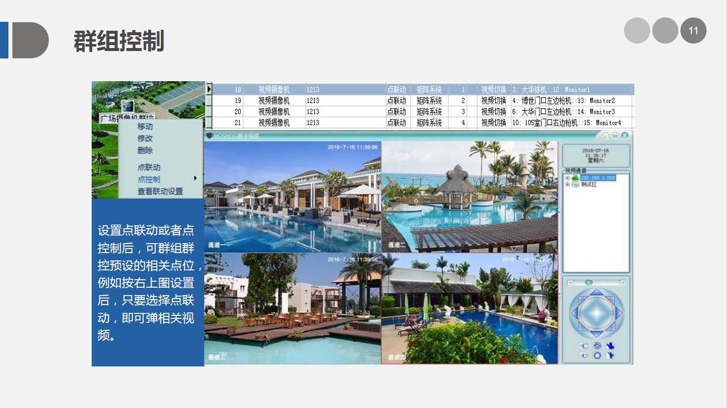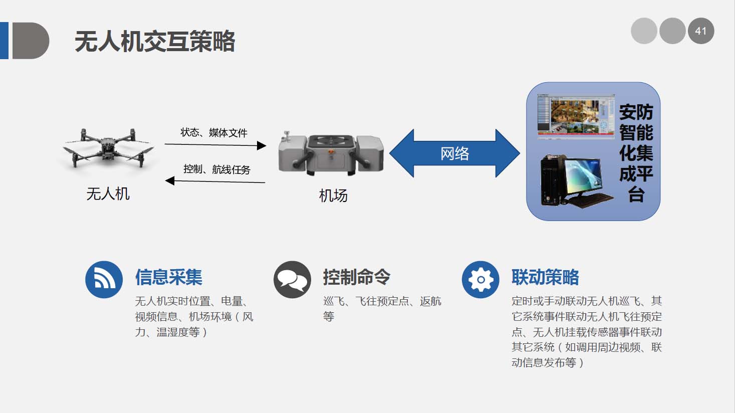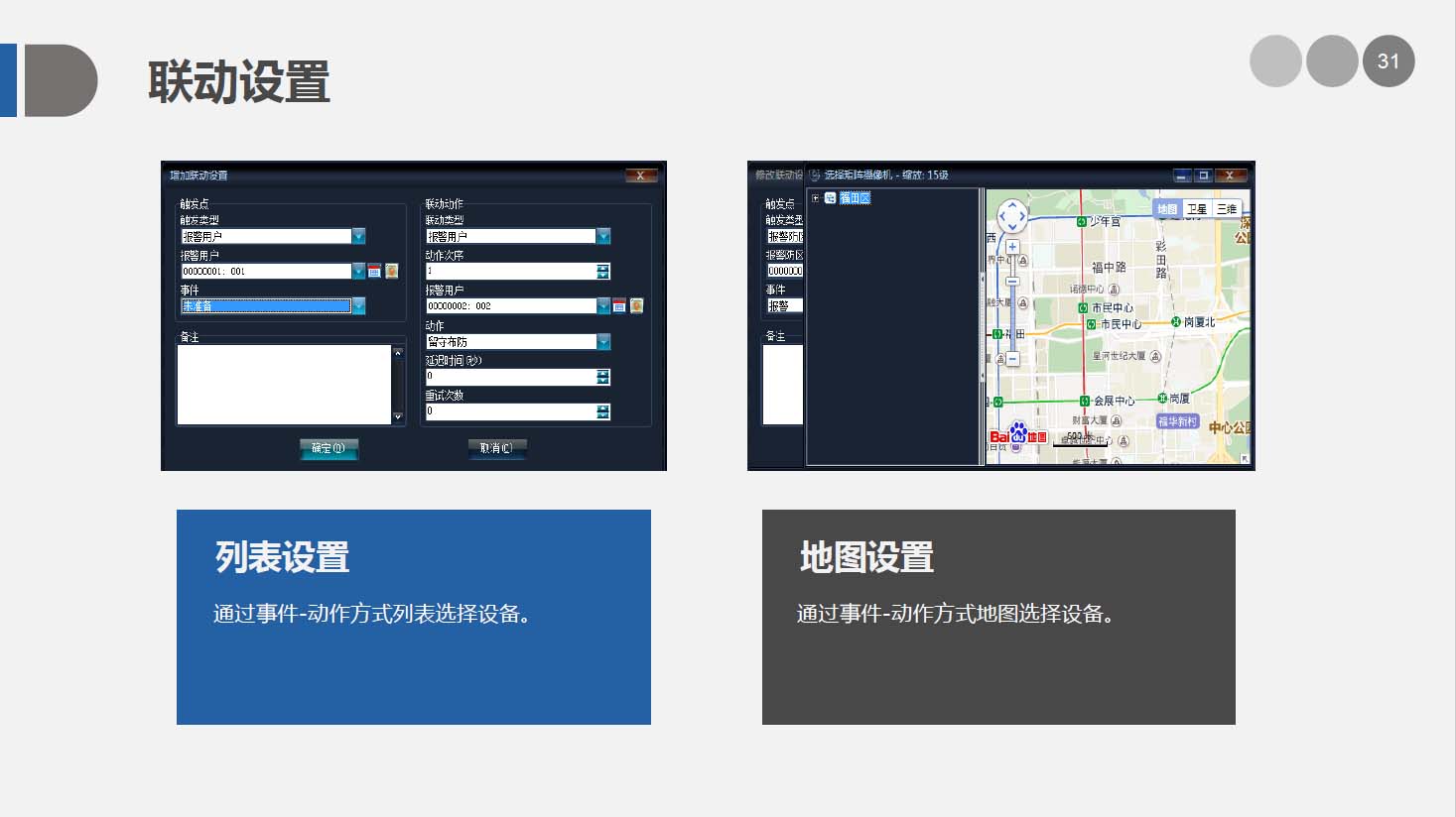 安防智能化集成平台能实现对视频、门禁、报警、对讲、巡更、车辆管理等多个子系统集中控制,统一调度使用,实现各个子系统之间的联动操作及管理。高度智能化的综合安防管理平台应具有适应于各种不同需求的网络架构、高度的可靠性、良好的人机交互界面、易于管理及维护、学习简单及操作方便等特点。