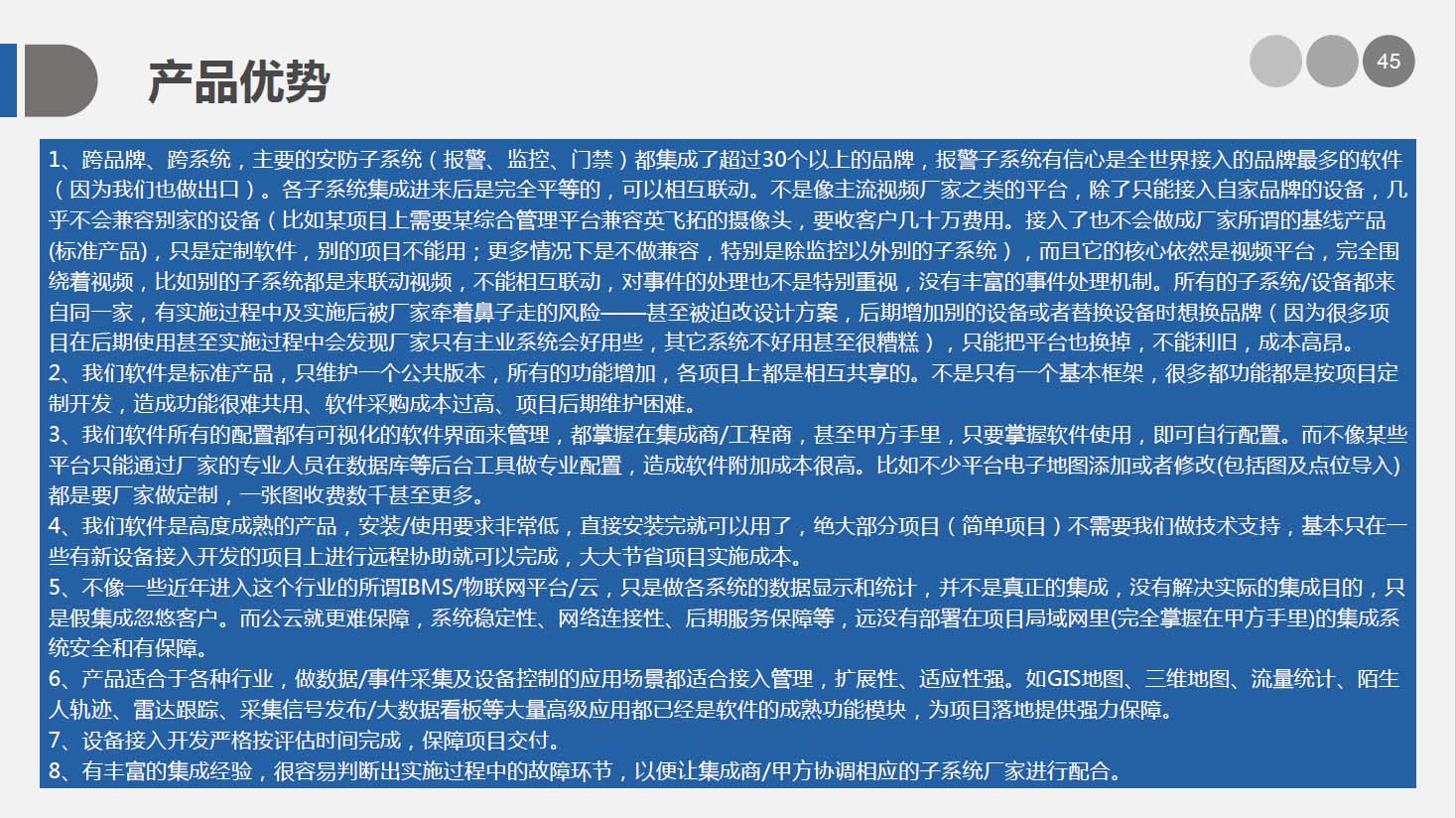 安防智能化集成平台是我司自主研发的,基于PSIM(综合物理信息安全系统) 开发的综合管理平台,实现对安防各子系统的集中控制、统一调度、联动操作及管理。并能与各行业业务系统对接,本身也具备通用业务管理功能。
