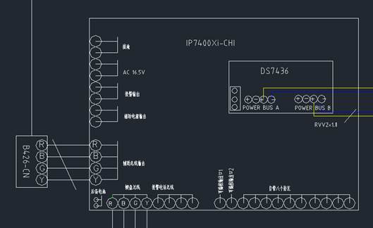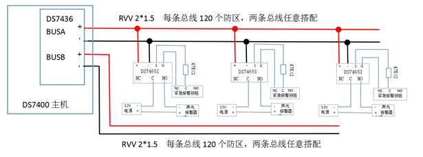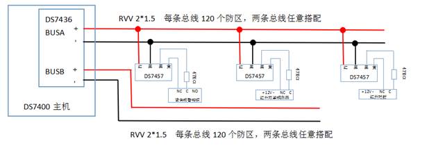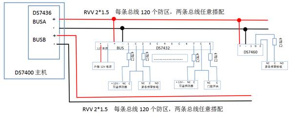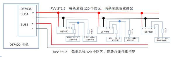 扩展防区则需要增加双回路总线驱动器(DS7436),扩展防区都接在两条总线上