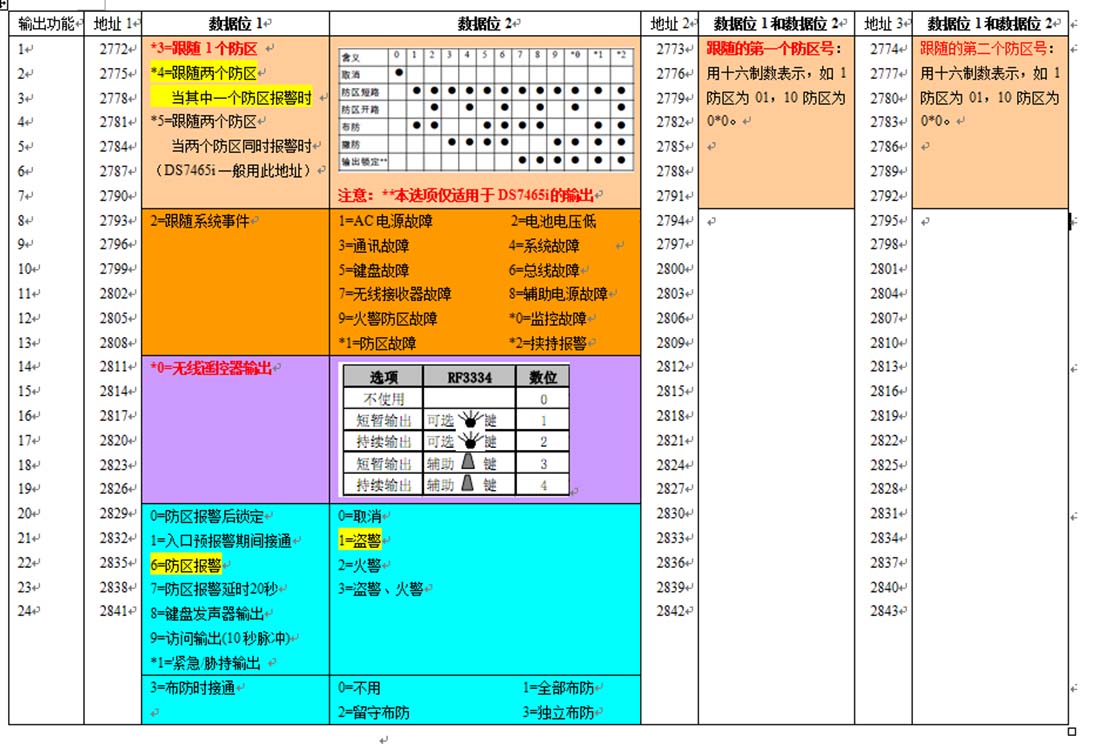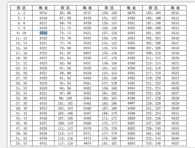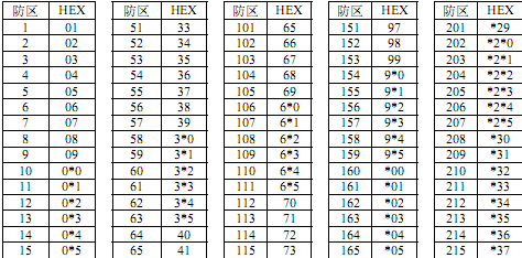 防区所对应模块类型的编程地址码对照表:
