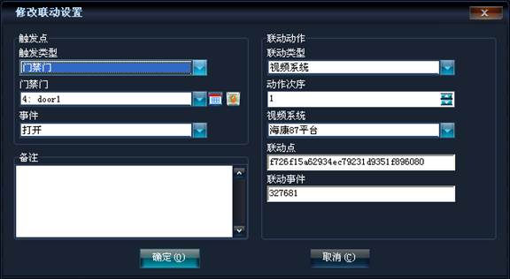 在集成平台软件的事件联动设置, 联动点对应点位资源ID, 联动事件对应事件代码,如下图: