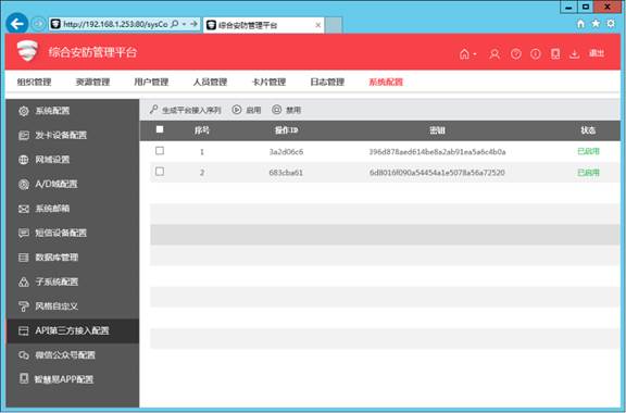 登录海康87平台,进入【主页?基础数据?系统配置-API第三方接入配置】页面,点击【生成平台接入序列】按钮,生成一个新的接入帐号,如下图: