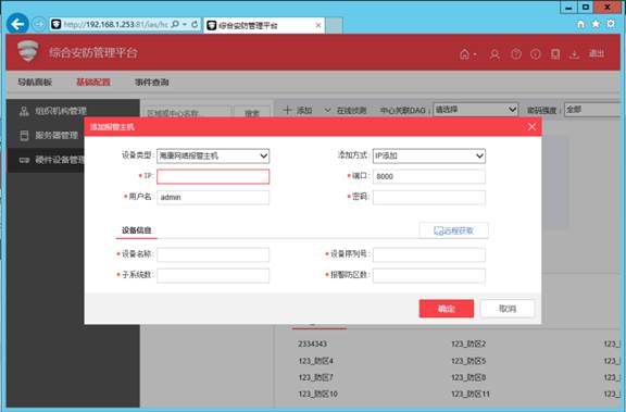 进入【主页?入侵报警系统?报警主机】页面,选择相应的组织树节点,点击【添加】按钮,增加一个虚拟报警主机,IP填写127.0.0.1;端口、用户名、密码、设备序列号随便填;主设备名称可以自行命名;子系统数可根据需要填入,不做区分可填入1;报警防区数根据需要填入,如下图: