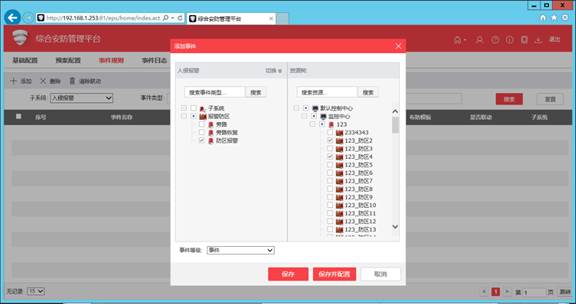 进入【事件中心?事件规则】页面,点击【添加】按钮,添加事件规则,在左边点击切换到“入侵报警”,展开报警防区,选择防区报警;在右边选择相关的报警防区,如下图: