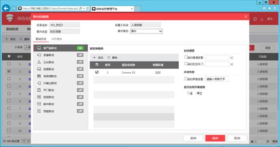点击【保存并配置】按钮,配置联动方式,如选择客户端联动,选择要联动的摄像机,如下图: