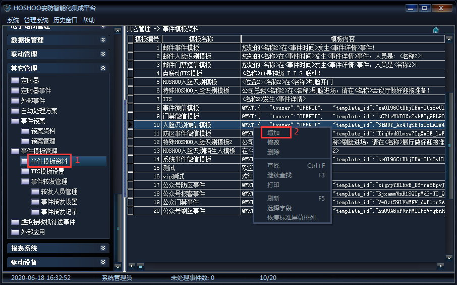 《其它管理》→《事件模板资料》→《事件模板资料》→右键菜单《增加》,如下图所示: