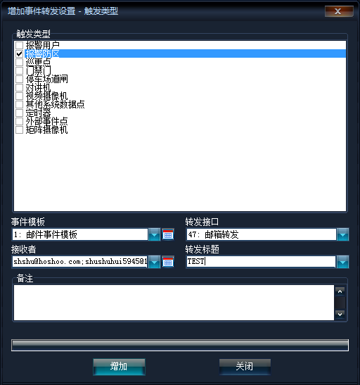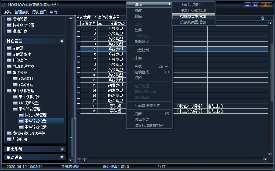 《其它管理》→《事件管理模板》→《事件转发设置》→右键菜单《增加》→《按触发类型增加》,如下图所示(以按触发类型增加为例):