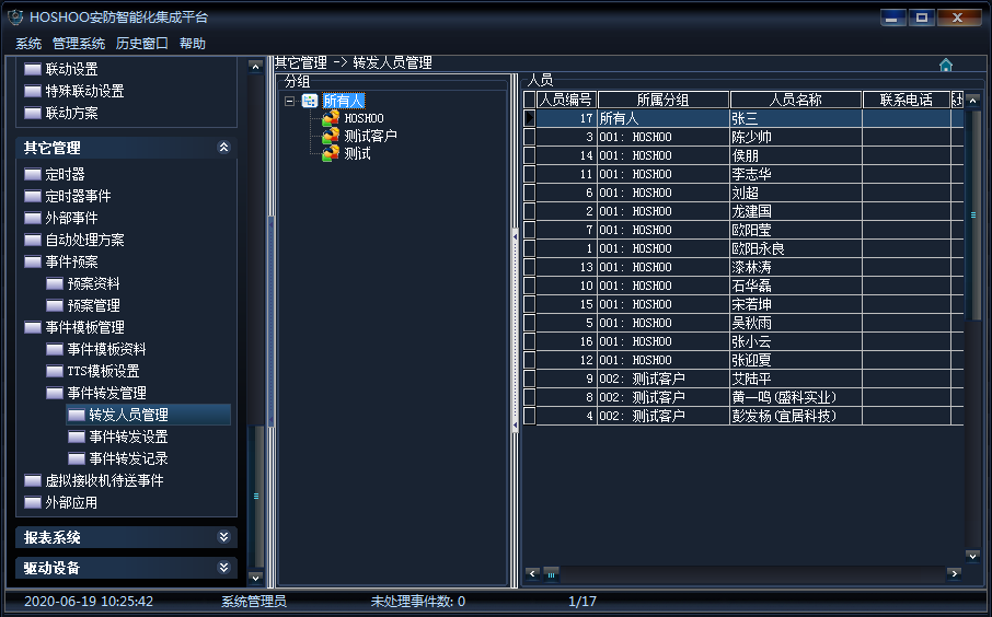 《其它管理》→《事件模板管理》→《事件转发管理》→《转发人员管理》,查看所有的分组和人员,如下图所示: