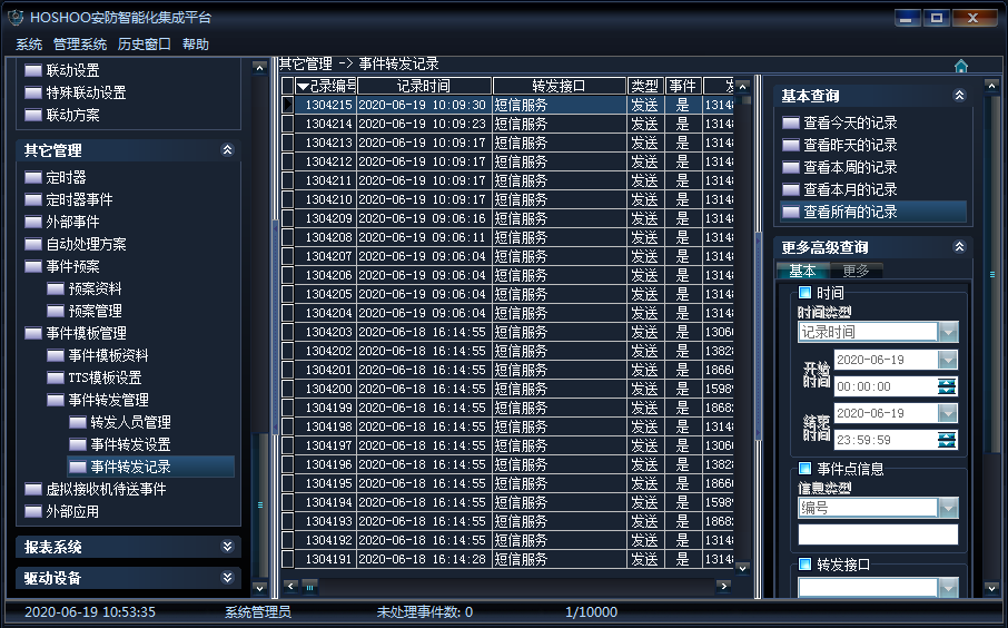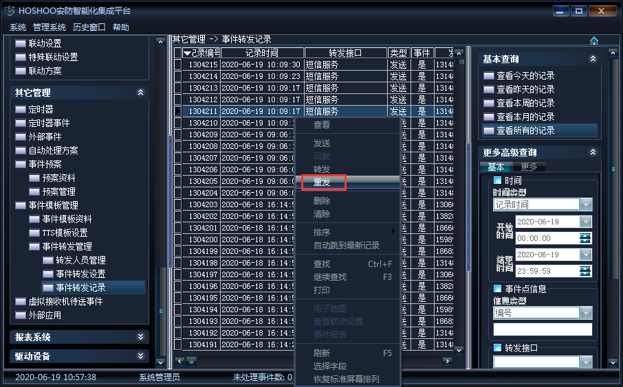 《其它管理》→《事件模板管理》→《事件转发管理》→《事件转发记录》;查看所有的转发记录,如下图所示: