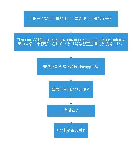 3. 从https://jdm.smart-ism.com/manager/ac/hoshoo/index页面中申请一个报警中心账户(注意:手机号需要与智慧主机的手机号一致);账户信息如下图: