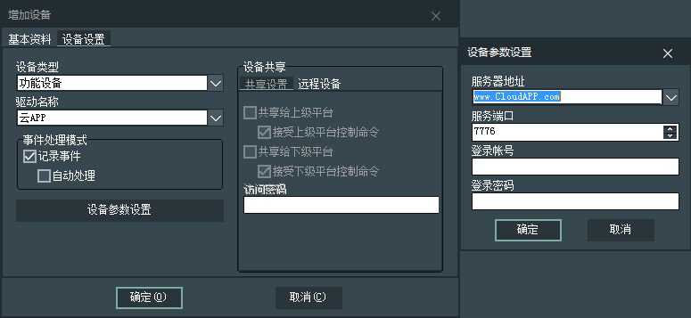 4. 在安防智能化集成平台端中的基本管理→设备管理中添加一个设备类型是功能设备,设备名称为云APP的设备信息(其中设备参数设置中的登录账号和登录密码通过上面的第3条申请获取)。