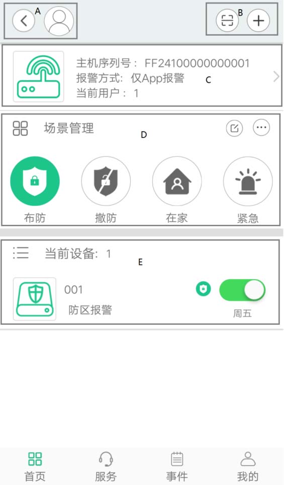 2. 在APP端主页点击一个主机,显示效果如下图,其中A部是返回键和查看用户信息;区是可以通过扫一扫扫描主机和设备的二维码使用旁边的加号可以添加主机、设备等信息;C区可以查看当前主机的相关信息;D区可以进行对主机的事件进行管理,如点击撤防按钮会在安防智能化集成平台端和APP端各自产生一条数据;E区点击当前事件可以查看当前主机的所有状态。