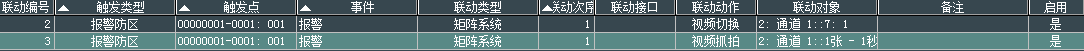 1. 需在安防智能化集成平台端设置联动管理中设置联动,要实现警报联动监控视频切换及拍照功能的效果,如下图所示的两条设置(另有抓拍图片数量等设置,请参考安防智能化集成平台手册):