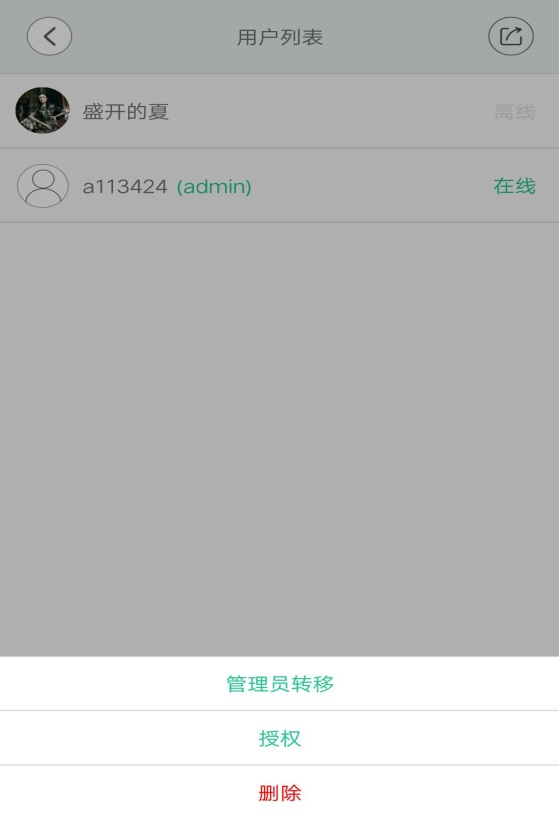 管理员转移:是将admin的权限给当前所点击用户,使当前点击用户为其设备的的管理员,可以使用二维码添加二级用户。