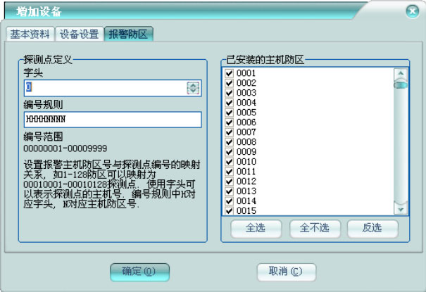 探测点定义:对每台报警主机定义不同的字头,以防区探测点号重复。可对编号规则进行相应的定义。