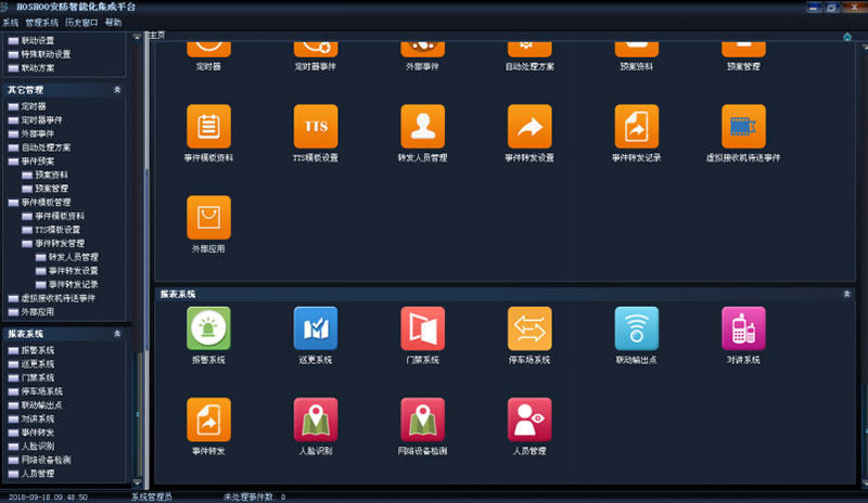 安防智能化集成平台可根据实际需求任意扩充选择报警、巡更、门禁、监控、停车场、对讲、广播等功能模块进行集中管理,并可以通过软件实现各个系统之间的联动、协调工作。从而大大减少了硬件设备和工程的数量,提高整个系统的自动化程度和保安管理中心的工作效率,完美地将这些系统之间的功能通过安保集成系统,来体现发生事件时如何做自动化处理及相应流程。