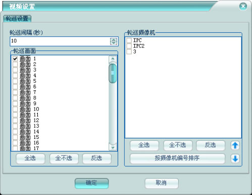 轮巡摄像机:选择用于做轮巡的摄像机。通过向上和向下按钮可改变摄像机的轮巡顺序。