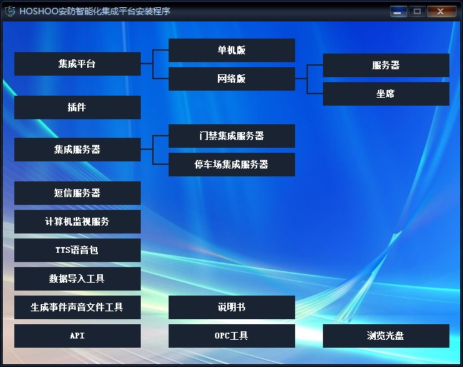 将安装光盘放入光驱内,双击运行光盘目录下的Autorun.exe,将弹出HOSHOO安防智能化集成平台安装程序界面,弹出下图: