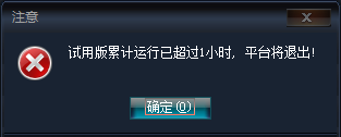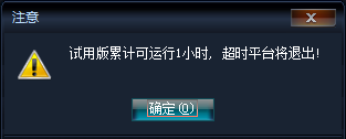 试用版平台,只允许连续运行1个小时,运行1个小时后,将弹进试用版超时提示框,如下图: