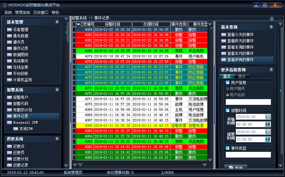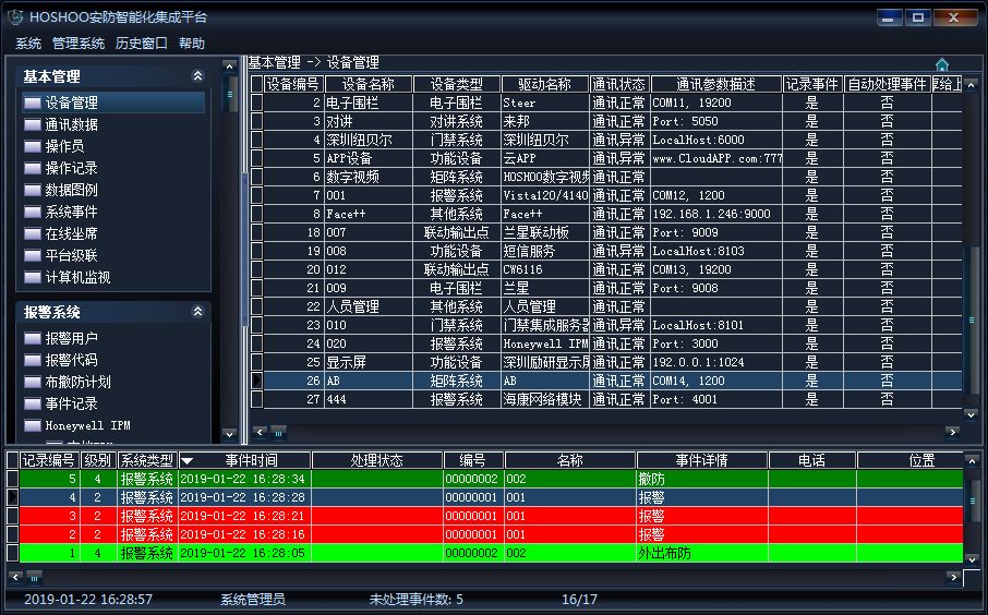 事件栏:平台接收新事件的显示区域,该处显示未处理事件。事件处理在这里进行,处理后,将从这里删除,将进入历史数据。