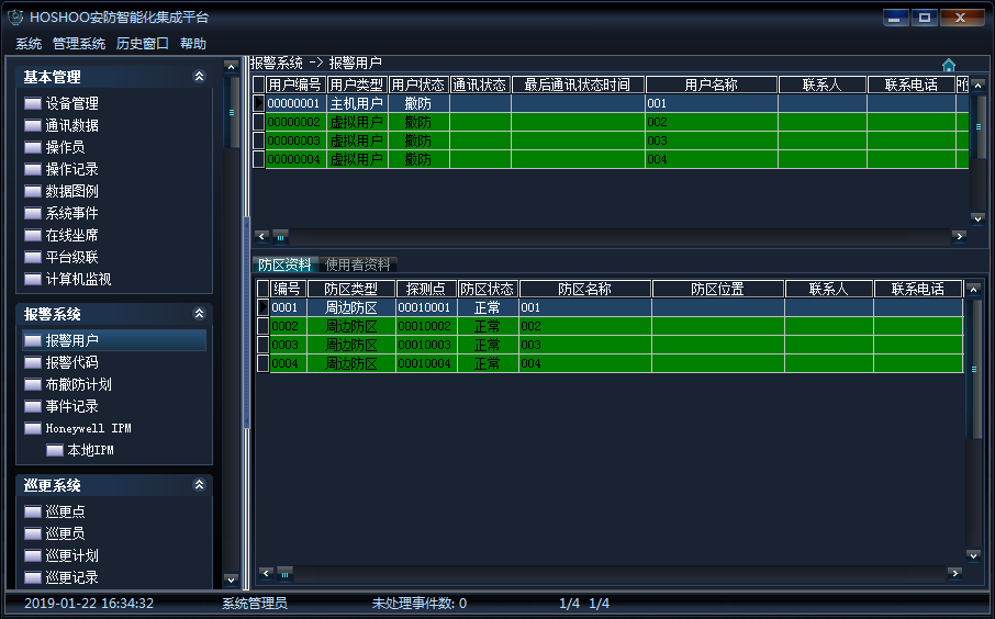在平台软件中操作面板里的报警系统面板组上,点击【报警用户】,功能区将显示报警用户数据网格,如下图:
