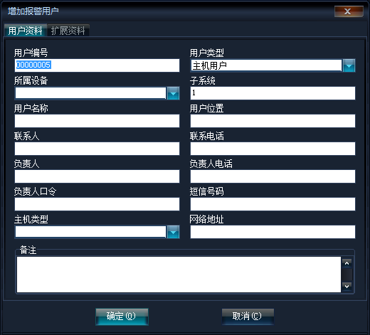 用户类型:主机用户:对应的报警主机;虚拟用户:对应平台虚拟出来的用户,受平台进行用户控制。如果选择为主机用户,则必须选择其对应的设备及子系统号。