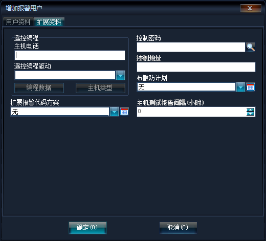 遥控编程:主机电话:主机所接电话的电话号码。遥控编程驱动:选择当前用户的报警主机对应的编程驱动。编程数据:点击之后,将弹出编程数据窗。主机类型:修改当前报警主机对应的编程主机类型。