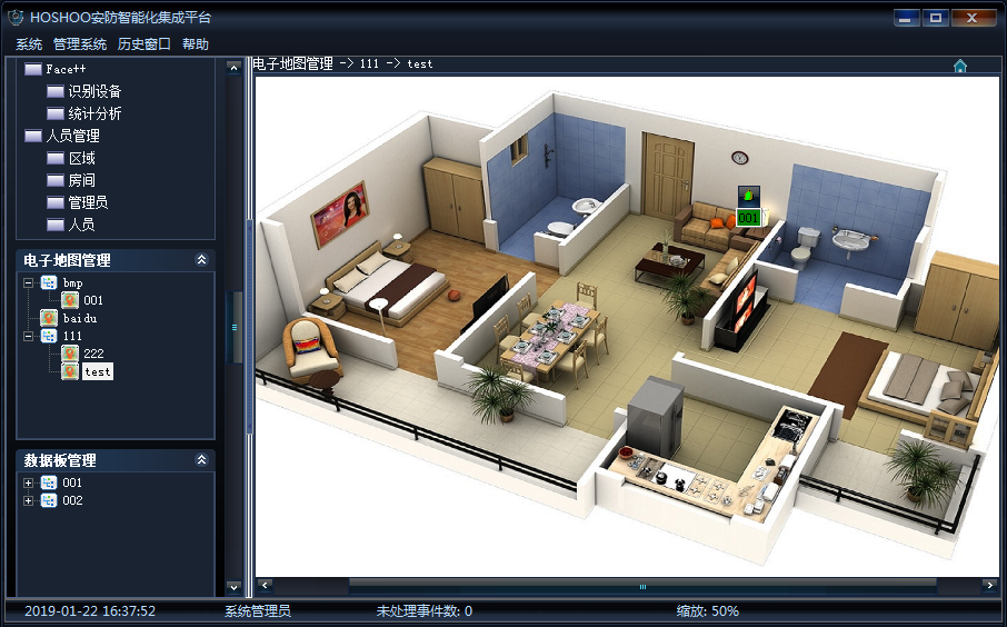 在平台软件中操作面板里的电子地图面板组上,点击要管理的电子地图,功能区将显示电子地图框,如下图: