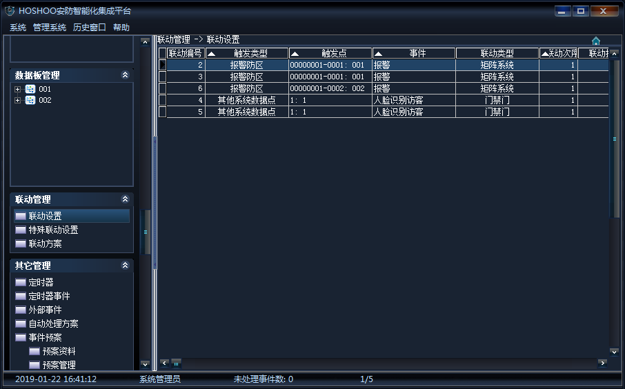 在平台软件中操作面板里的联动管理面板组上,点击【联动设置】,功能区将显示联动设置数据网格,如下图:
