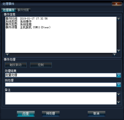 当事件栏有未处理事件时,可通过右键菜单【处理事件】或者双击要处理的事件,弹出处理事件框,如下图: