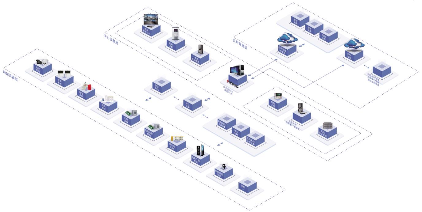 前端设备层是各子系统安装在前端的采集设备;中心设备层是各子系统部署在后端的处理设备或者管理软件,前端设备通过总线、无线或者网络等方式跟中心设备层组网;集成平台在中心设备层与各子系统进行集成;应用管理层是集成平台值班坐席及集团化平台级联管理。