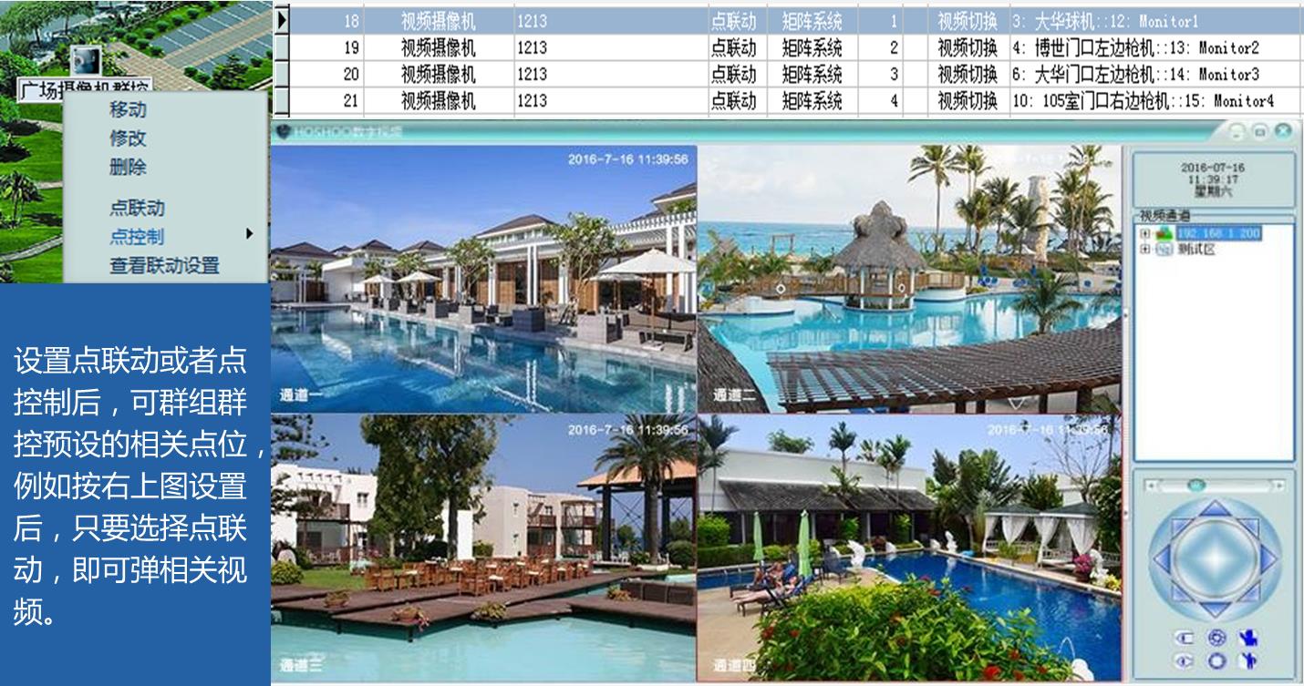 下图示例演示了通过点联动一键调取4个摄像机的视频: