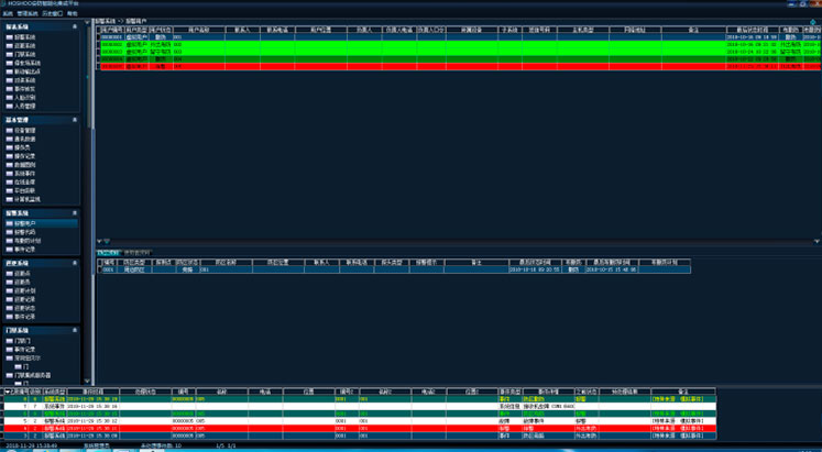 上部的左边区域,显示报警用户树,展开某一用户,为该用户的防区;右边为控制区域,上面为控制功能区,下面为状态区。