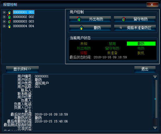 下部为详细资料显示区,用户树中,选择用户,显示该用户的详细资料;选择防区,显示该防区的详细资料。